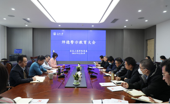 2023年12月4日,信息工程学院在学院会议室召开师德警示教育大会,通报师德师风违规典型案例。学院党政领导、全体系部室主任、各教工党支部书记参加会议。会议由党委书记胡予欣主持。 胡予欣带领大家集体学习了《新时...
