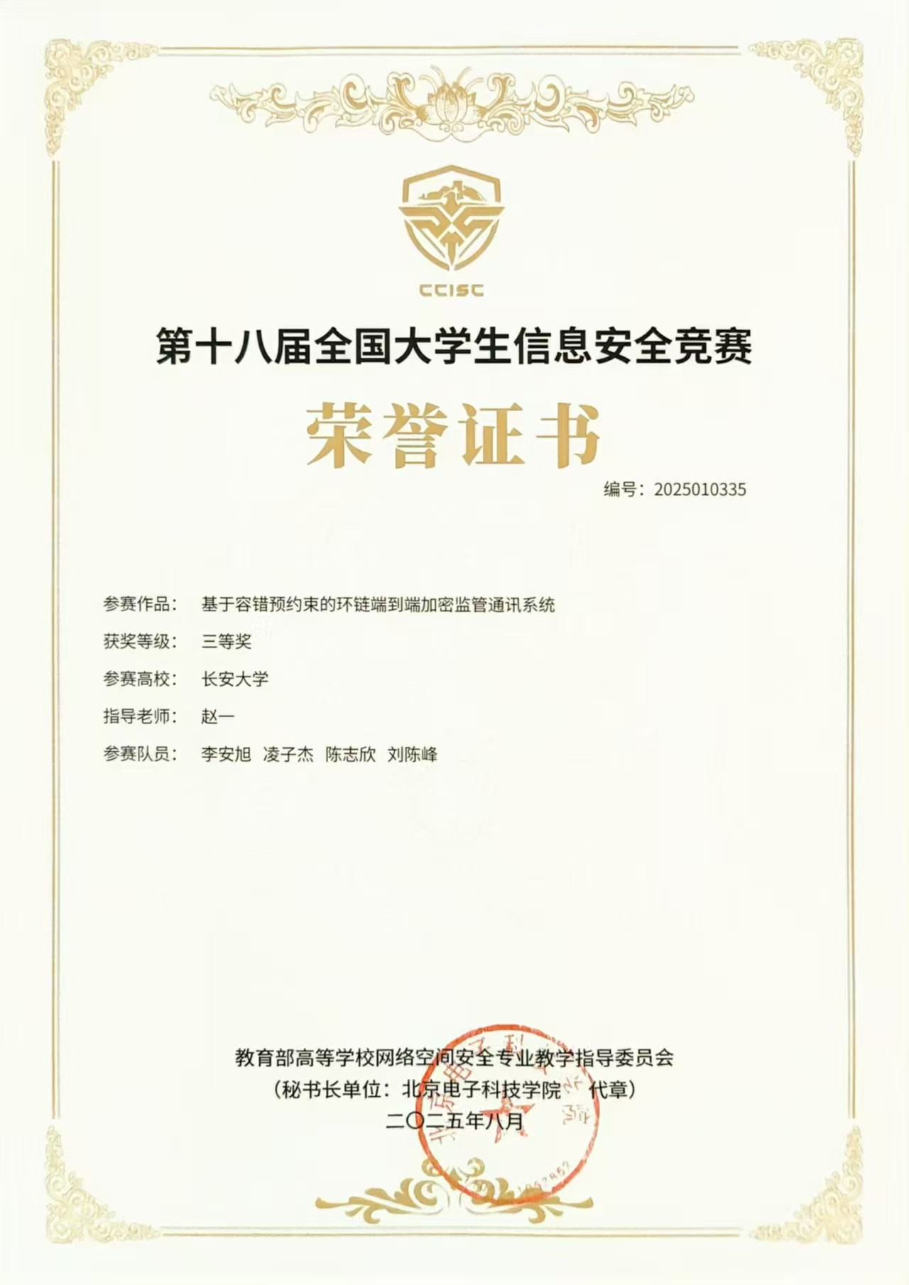 2025年8月14日,第十八届全国大学生信息安全竞赛作品赛决赛在西安交通大学兴庆校区举办,长安大学信息工程学院李安旭、凌子杰、陈志欣、刘陈峰四位本科生同学组成的长大网安小队,由赵一老师指导的作品—《基于容错预...