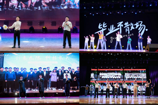 毕业典礼开场视频回顾了大学四年的点点滴滴;舞蹈、联唱歌曲《无名的人》《干杯》既是对青春的告别,也承载着对未来的展望。