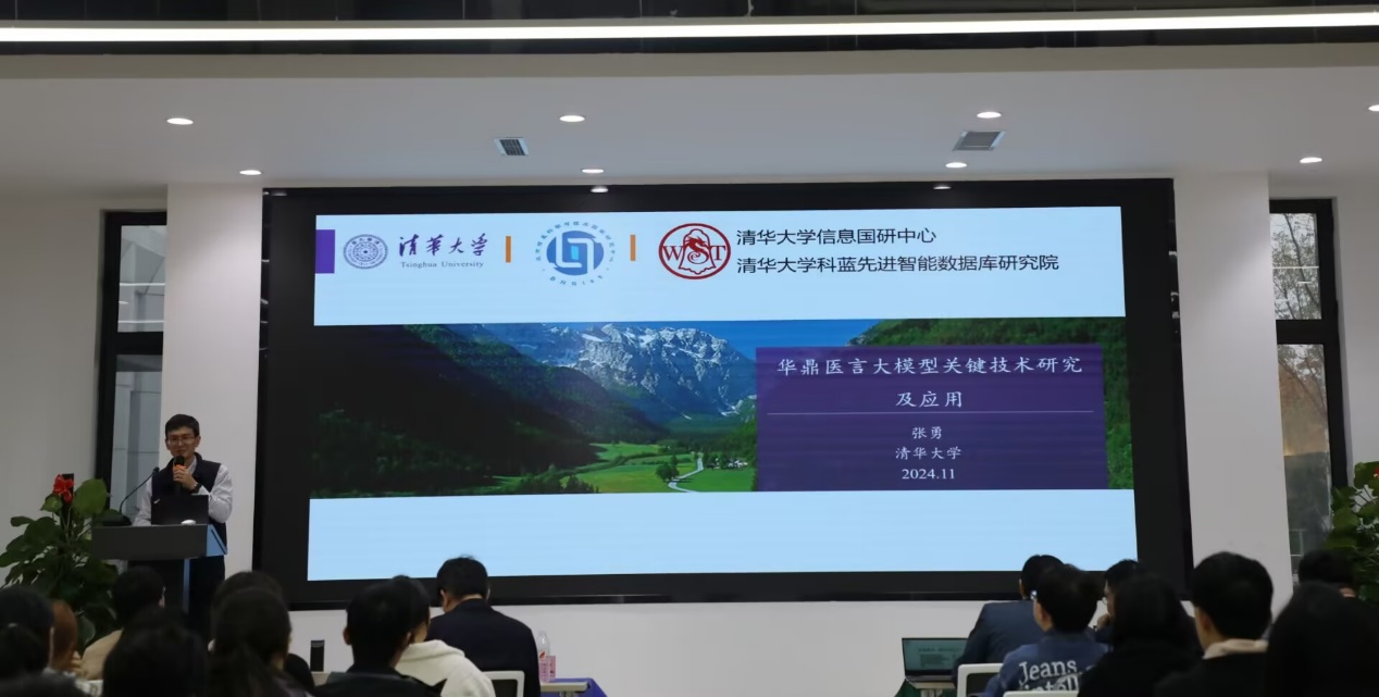 张勇教授以“华鼎医言大模型关键技术研究及应用”为题进行了主题报告,以华鼎医言大模型为切入点,介绍了华鼎医言大模型是由先进的智能数据库研究院开发的一个项目,该项目旨在国产化和打造全员型分布数据库,专注于人工智能、区块链、大数据管理和人工智能技术的应用研究。