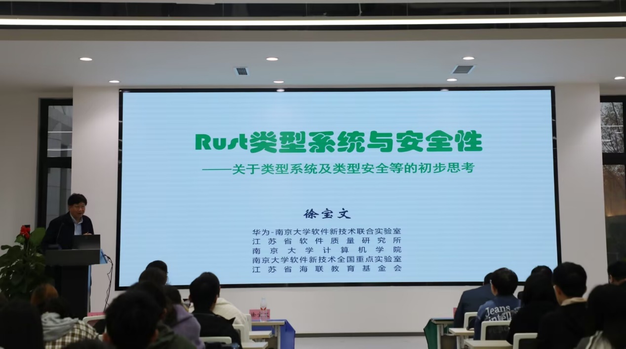 徐宝文教授以“Rust类型系统与安全性——关于类型系统及类型安全等的初步思考”为题进行了专题报告,徐教授提到Rust语言作为系统级编程领域的新星,以其卓越的性能和安全性受到广泛关注。