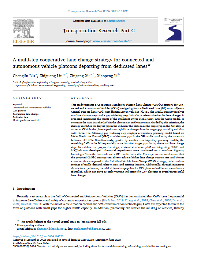 近日,我院博士生刘成林在导师徐志刚教授的指导下,以第一作者身份在交通运输工程学科国际顶级期刊《Transportation Research Part C : Emerging Technologies》(TR-C)上发表论文“A multistep cooperative lane change strategy for connected and autonomous vehicle platoons departing from dedicated lanes”(自动驾驶专用车道车辆队列多步协同换道策略)。论文通信作者为徐志刚教授和刘志广讲师,论文第一署名单位和通信作者单位均为长安大学。