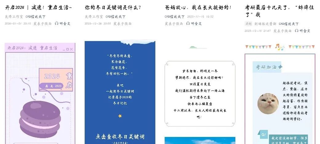 此外,学院通过微信公众号、微信视频号、微博、QQ空间号等媒体平台构建心理育人媒体矩阵,做好心理健康知识科普宣传,打造“生活感悟”、“温暖行动”、“心愿墙”等宣传模块分享学生校园生活,营造积极阳光,开朗向上的心理育人氛围。