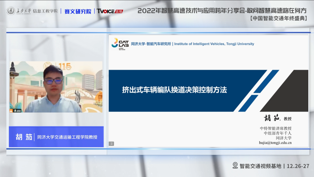 同济大学交通运输工程学院国家青年千人专家胡笳教授以《挤出式车辆编队换道决策控制方法》为主题,做了精彩的报告。车辆编队是未来智慧高速公路最有商业应用价值的落地场景之一,胡笳教授创新地提出了一种基于蛇形运动的仿生式车辆编队横向控制策略,并基于MPC控制算法实现了车队换道轨迹的精准跟踪,最后胡教授还系统介绍了车辆编队的实车测试情况和在洋山港的示范应用情况。