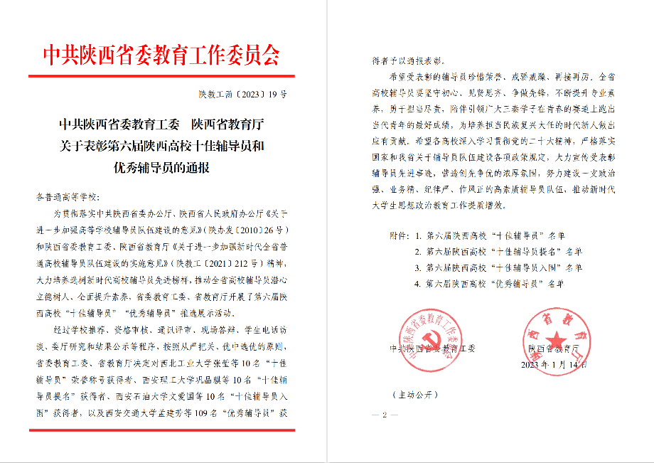 陕西高校“十佳辅导员”“优秀辅导员”荣誉称号系我省辅导员荣誉表彰体系的最高序列奖项。该评选展示活动每两年举办一次,旨在全面贯彻落实习近平总书记关于教育的重要论述,大力培养选树新时代高校辅导员先进榜样,推动高校辅导员潜心立德树人、全面提升素养。此次全省共评选出“十佳辅导员”10名,“优秀辅导员”109名。