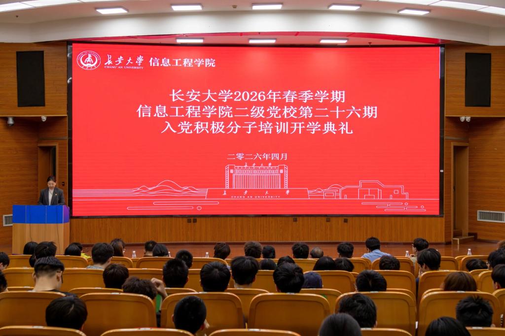 长安大学2026年春季学期信息工程学院二级党校第二十六期入党积极分子培训开学典礼于4月9日在北校区图书馆西侧裙楼报告厅顺利举行。长安大学党校常务副校长闫妍,信息工程学院党委书记陈俊鹏,团委书记杨加玉,学生工作办公室全体辅导员及本期入党积极分子培训班全体学员参加开学典礼。典礼由学院党委副书记郭咏梅主持。