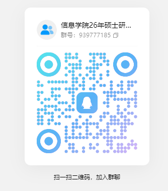 参加复试的考生均须加入“信息学院26年硕士研究生复试”QQ群(群号:939777185,申请加群格式:报考专业+姓名+考生编号,群内请实名),请务必于3月27号前加群,具体的复试安排将在群内发布,请积极关注群内发布的相关通知。