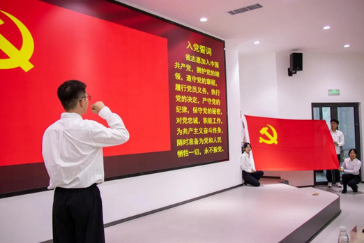 入党宣誓仪式上,在学院本科生第五党支部书记秦丰的带领下,全体党员面向党旗庄严宣誓。