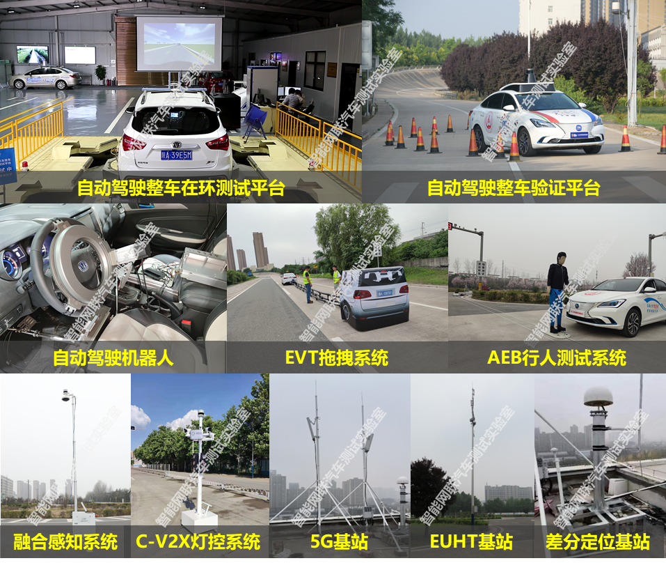 实验室现有实验用房750平米,拥有V2X测试研究室、车路协同研究室、自动驾驶研究室、封闭场地测试研究室、虚拟仿真测试研究室、整车在环测试实验区、智能网联汽车实验区、智能车路协同实验区。拥有包括5G车联网通信系统、4G车联网通信系统、C-V2X车联网实验平台、EUHT车联网实验平台、AEB行人测试系统、自动驾驶硬件在环测试系统、自动驾驶整车在环测试系统、自动驾驶整车验证平台、PreScan自动驾驶虚拟仿真平台、自动驾驶机器人、GNSS信号模拟器等多种智能网联汽车研发、测试相关大型/精密仪器设备等在内的各类仪器、设备650余台(套/件),设备原值2100余万元。