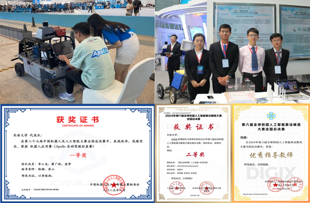 实验室建立了大学生开放共享机制,支持学生开展各类创新创业竞赛活动。实验室积极组织学生参加“大创”、“互联网+”、“挑战杯”、人工智能算法精英大赛、中国大学生计算机设计大赛等计算机领域10余项学科竞赛,学生先后获得大学生电子设计竞赛国家级一等奖、挑战杯国家级二等奖、中国机器人及人工智能大赛国家级一等奖、人工智能算法精英大赛国家级一等奖、OnSite自动驾驶算法挑战赛优胜奖等省部级以上奖励40余项,有力支撑了我院本科生和研究生的动手实践能力的培养。