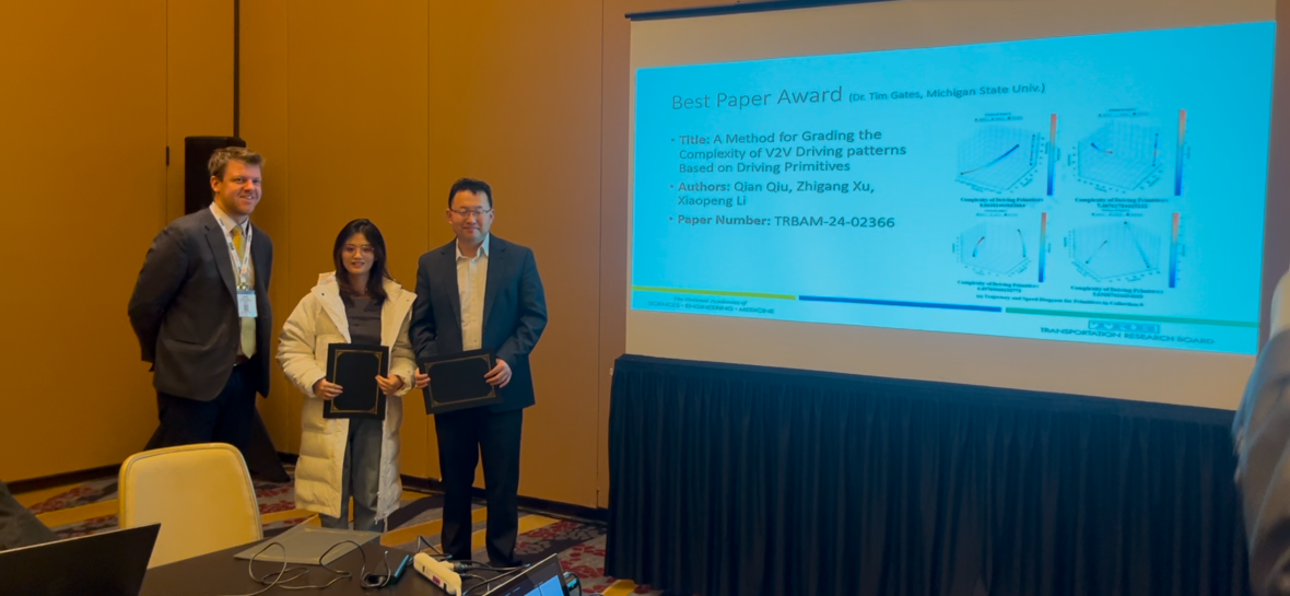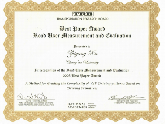 2025年1月,第104届交通领域国际顶级会议TRB(Transportation Research Board)年会在美国华盛顿隆重召开,我院博士生邱倩在导师徐志刚教授的指导下,以第一作者身份发表的论文“A Method for Grading the Complexity of V2V Driving patterns Based on Driving Primitives”(基于驾驶基元的V2V驾驶模式复杂度自动分级方法)获得TRB ACH50委员会颁发的2025年度最佳论文奖。该论文的通信作者为我院徐志刚教授,论文第一署名单位和通信作者单位均为长安大学。