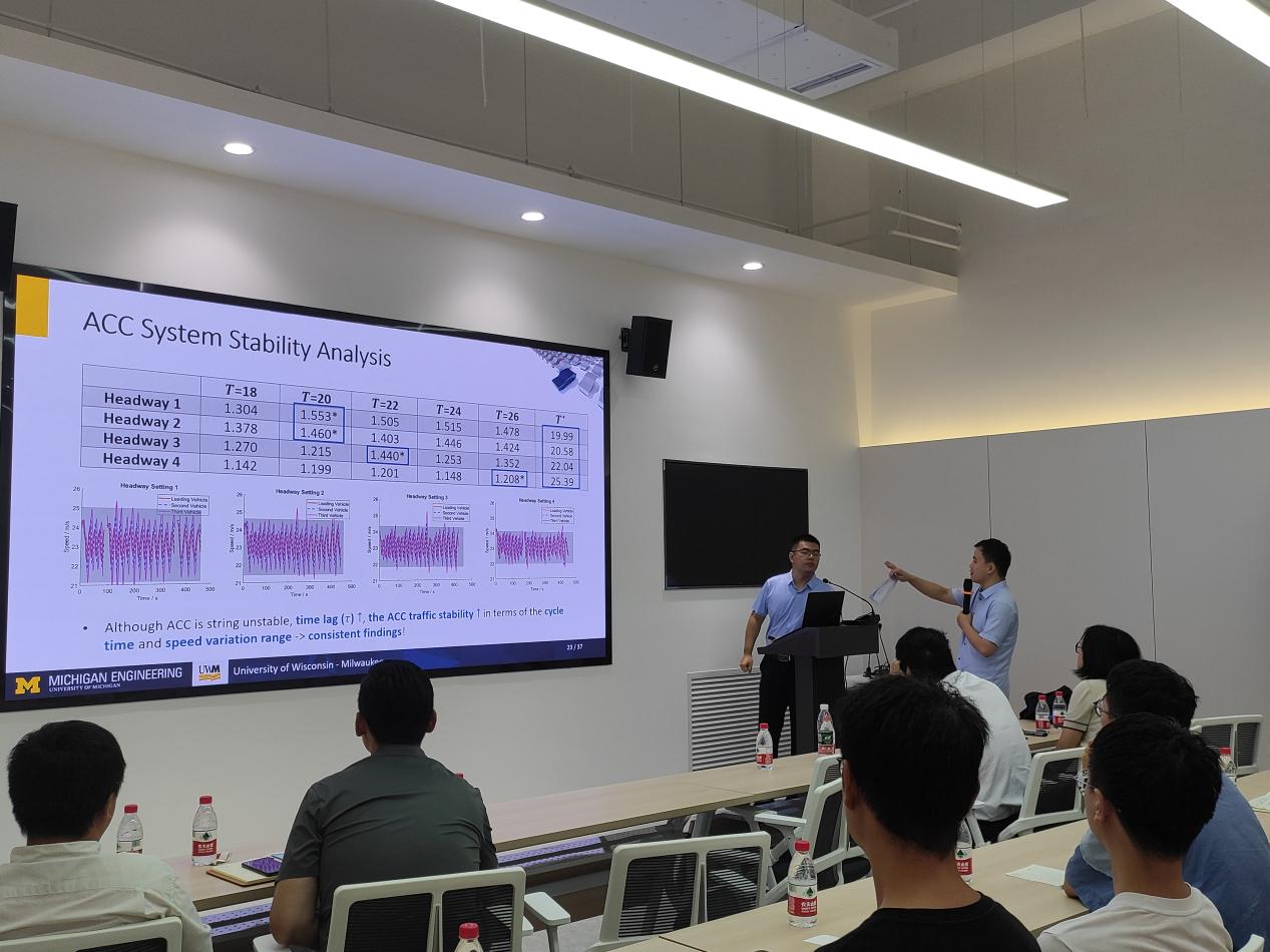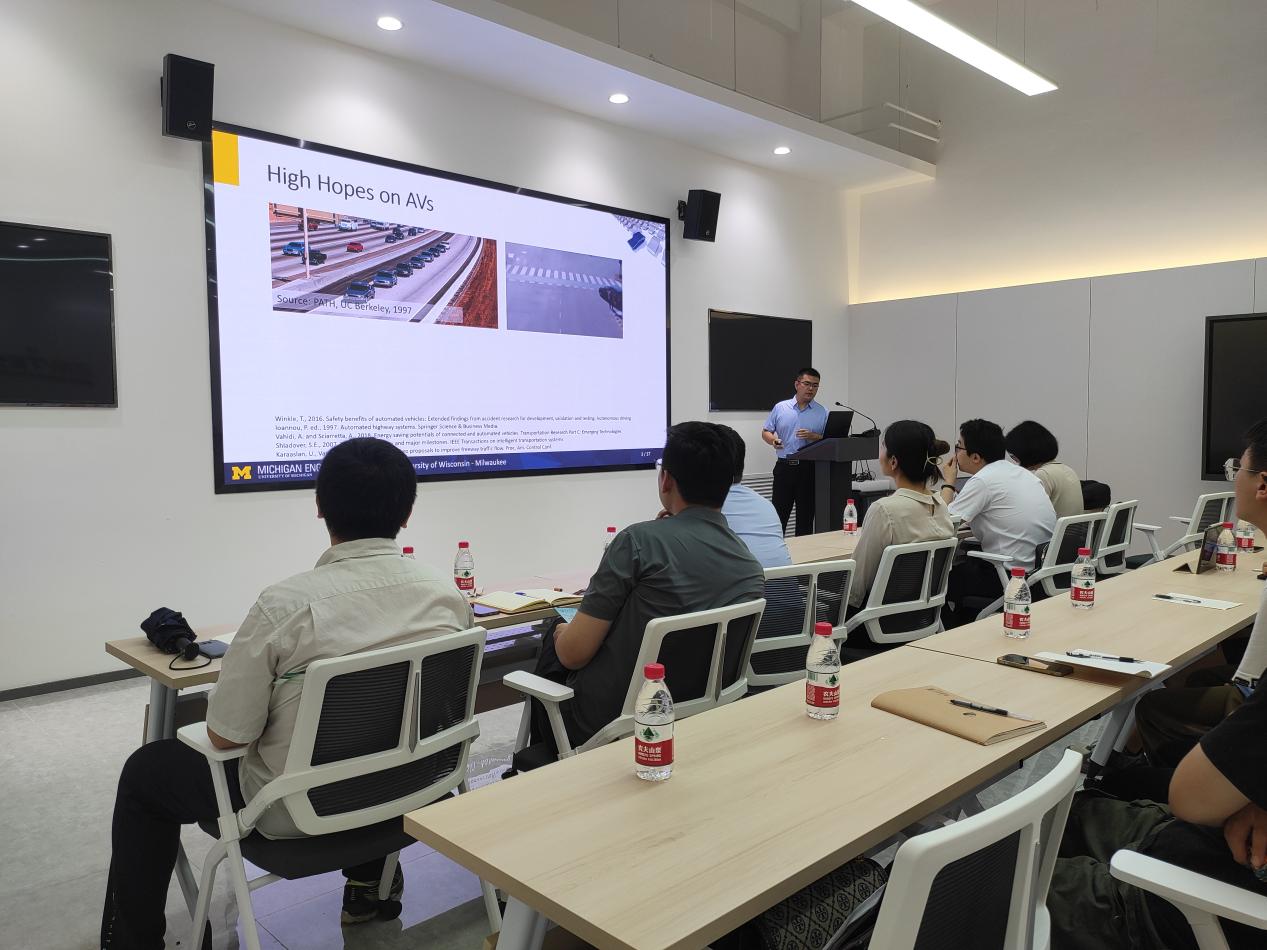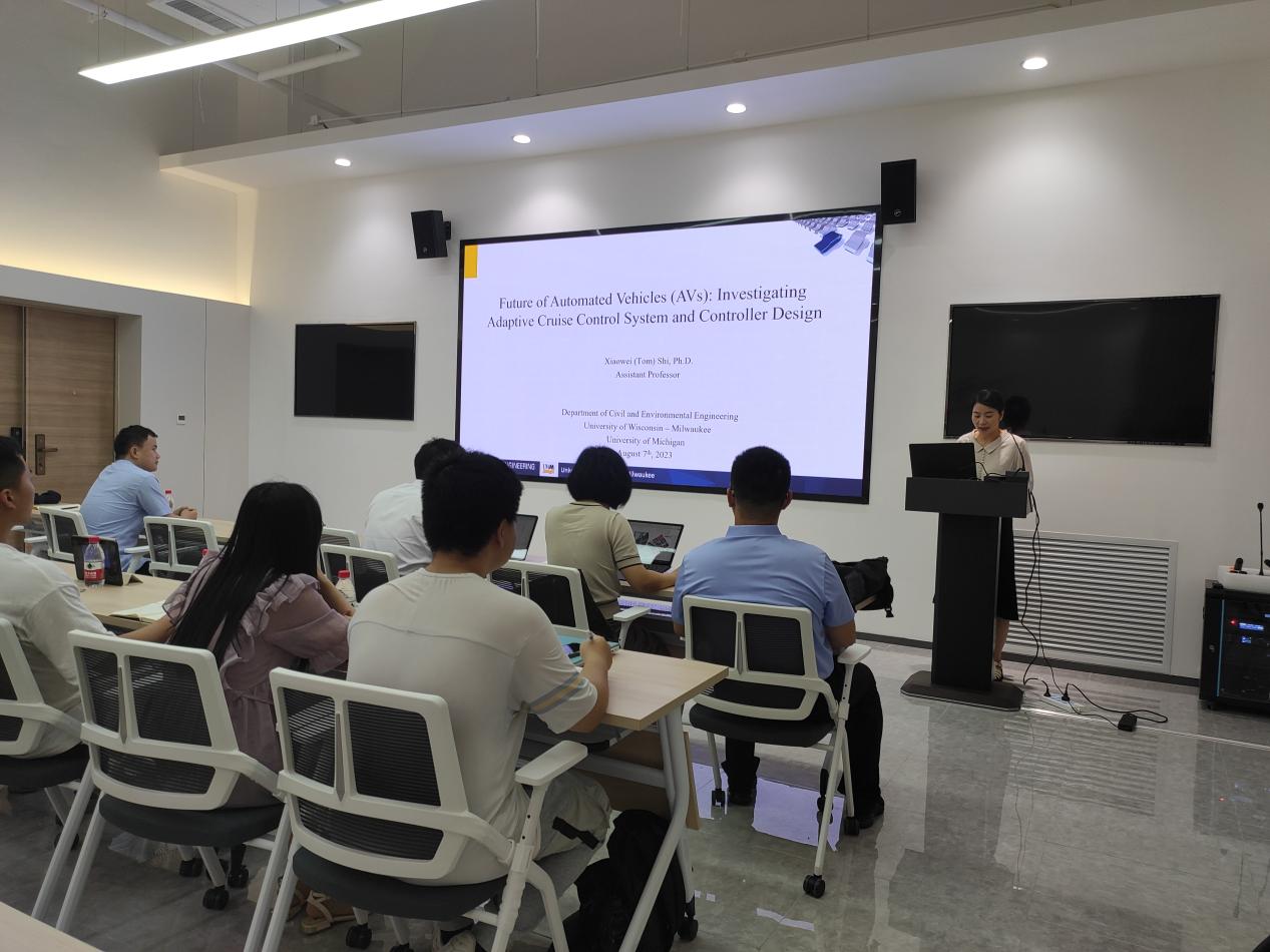 2023年8月7日在北校区车联网与智能汽车测试技术研究院一层110会议室,应郝茹茹老师邀请,威斯康星大学密尔沃基分校(University of Wisconsin - Milwaukee)土木与环境工程系助理教授师晓玮博士到信息工程学院开展学术交流,并作题目为“自动化汽车的未来:自适应巡航控制系统的研究和设计”的学术报告。