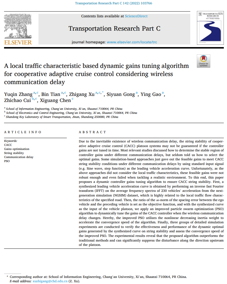 近日,我院博士生张宇琴以第一作者身份在交通运输工程学科国际顶级期刊《Transportation Research Part C : Emerging Technologies》(TR-C)上发表论文“A local traffic characteristic based dynamic gains tuning algorithm for cooperative adaptive cruise control considering wireless communication delay”(通信延时条件下基于局部交通特性的协同自适应巡航控制增益动态整定算法)。论文通信作者徐志刚教授为张宇琴同学的博士生导师。论文第一署名单位和通信作者单位均为长安大学信息工程学院。TR-C目前是全球交通运输学科领域的顶级期刊,主要报道前沿新兴技术在交通运输领域的最新应用,该刊当前影响因子为9.022,在中科院和科睿唯安JCR分区中均属于Q1类Top期刊。