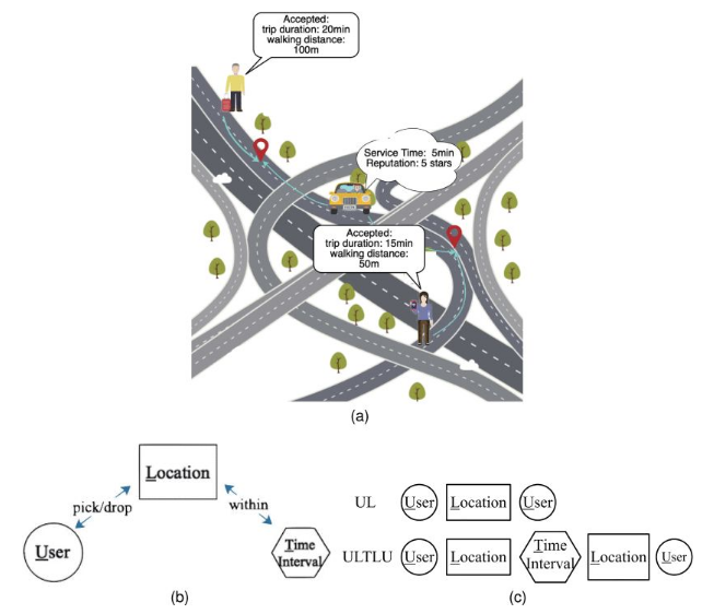 1)从某市200万用户的真实出行行为中创建属性共享出行网络(attributed pooling network ,ARN),并为ARN开发了高效且可扩展的表示学习方法(Joint Embedding for personalized Ranking in pooling, JERR)以缓解稀疏问题,该方法可以协同学习每个司机-乘客对的出行行程和偏好接近度。