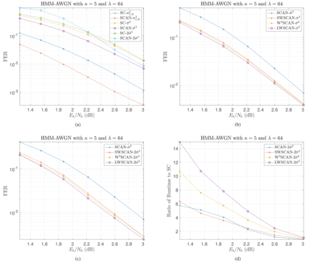 为此,作者研究了在广义的Gilbert-Elliott信道模型下,当信道参数未知情况下的极化码解码问题。在软取消(SCAN)平台上,作者提出了三种自适应的算法,第一种是滑窗SCAN(SWSCAN),它是SWBP从LDPC码到极化码的扩展;随后通过二次规划优化SWSCAN的tap权值,从而得到加权窗SCAN(W2SCAN);第三种是线性加权SCAN(LWSCAN),它是LW算法从源估计到信道估计的扩展。三种自适应SCAN算法在广义Gilbert-Elliott信道上显著提高了极性码的性能。