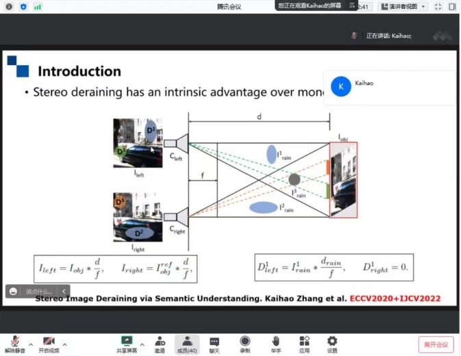 Zhang博士介绍了几个图像增强任务的热门方向和他的相关工作,包括图像超分辨率,双目图像去雨和图像去雪。在图像超分辨率方面,主要阐述了如何通过建立模型把低分辨率的图像转换成高分辨率的图像,并能够有效的去除图像中的噪声;在双目图像去雨方面,主要阐述了如何通过双目图像和语义信息来提升图像去雨效果;在图像去雪方面,主要阐述了图像增强的适应性学习效果及其在图像去雪中的原理。