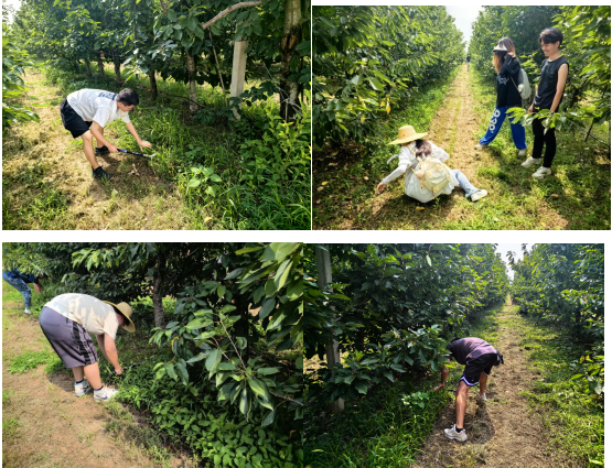 完成基础户外劳动培训后,在劳动指导老师的带领下,学生们走进劳动基地的果园开始清理杂草。学生手持镰刀,弯腰割草的动作从略显生疏到逐渐熟练。有人主动调整姿势提高效率,现场充满“嚓嚓”的割草声。通过这场辛勤劳动同学们更是领悟到“一粥一饭,当思来之不易;半丝半缕,恒念物力维艰”的深刻内涵。