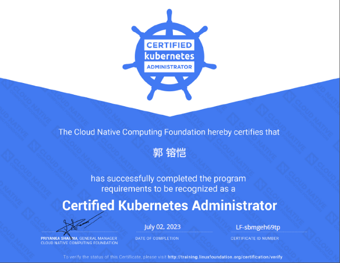 7月2日上午,长安大学信息工程学院物联网与网络工程系2020级本科生郭镕恺参加CNCF云原生基金会的CKA认证管理考试,经过2小时高强度的实操考验,以89分的成绩顺利通过考试,荣获“CNCF CKA管理专家”证书。取得了历史性的突破,目前为陕西高校在校生CKA第一人。
