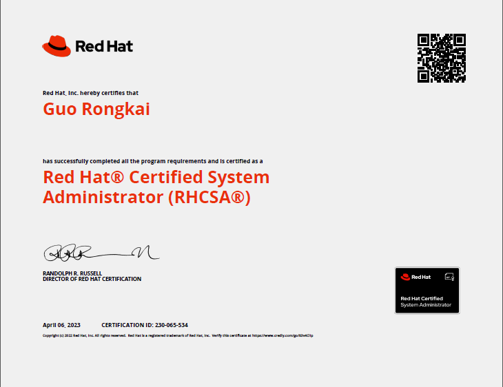 郭镕恺-红帽RHCSA系统管理员证书 郭镕恺-美团Offer