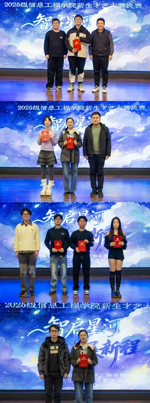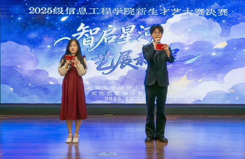 为展现新时代大学生的青春朝气与多元才艺,推动学生全面发展,展现学院育人风采,信息工程学院2025年新生才艺大赛决赛于12月18日晚7点在大学生活动中心三楼多功能报告厅火热开赛。整场活动以“智启星河,艺展新程”为主题,以多元形式展现新生才艺。校团委社团文体部副主任韩烁,学院团委书记杨加玉,各年级辅导员,校大艺团团长李龙威以及博雅之星获得者赵彬受邀出席,与现场百余名师生共同见证这场由青春与热爱造就的视听盛宴。